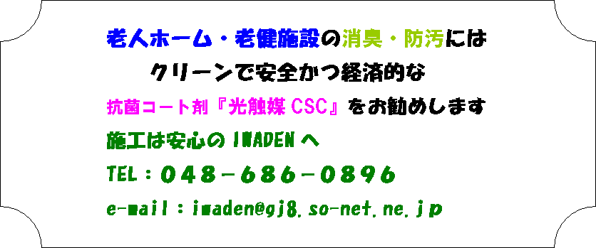 1. 病室・汚物室等から発生する所にコーティングする事により、悪臭の主成分である、アンモニア、硫化水素、メチルメルカプタン、トリメチルアミン、アセトアルデヒド、ホルムアルデヒド等の分子が、コーティング部分に接触する事により分解され、悪臭が大幅に軽減されます。また室内においては、空気清浄機と併用することにより、いっそうの相乗効果を発揮します。